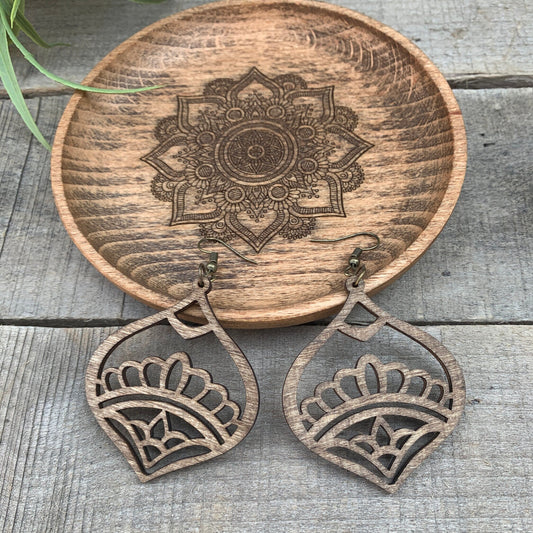 Wood Mandala Statement Boho Earrings - Lightweight - Gypsy Style