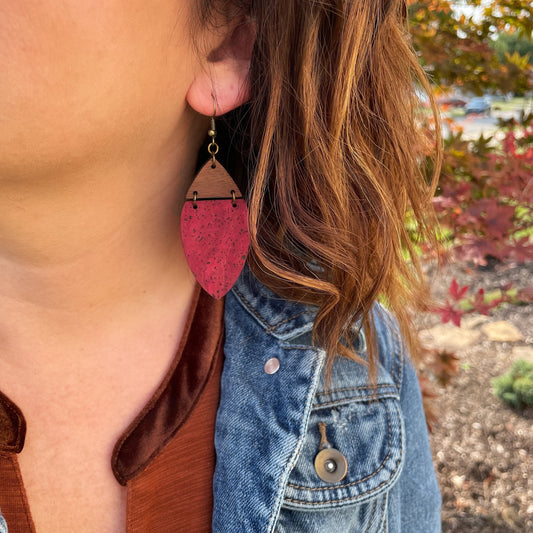 Boho Cranberry Cork & Walnut Wood Earrings - Lightweight