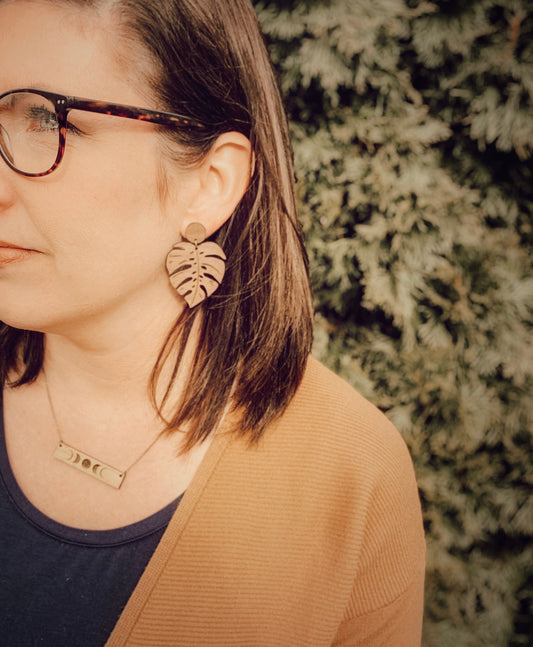 Walnut Wood Monstera Leaf Dangle Stud Earrings - Laser Cut Statement Earrings- Lightweight