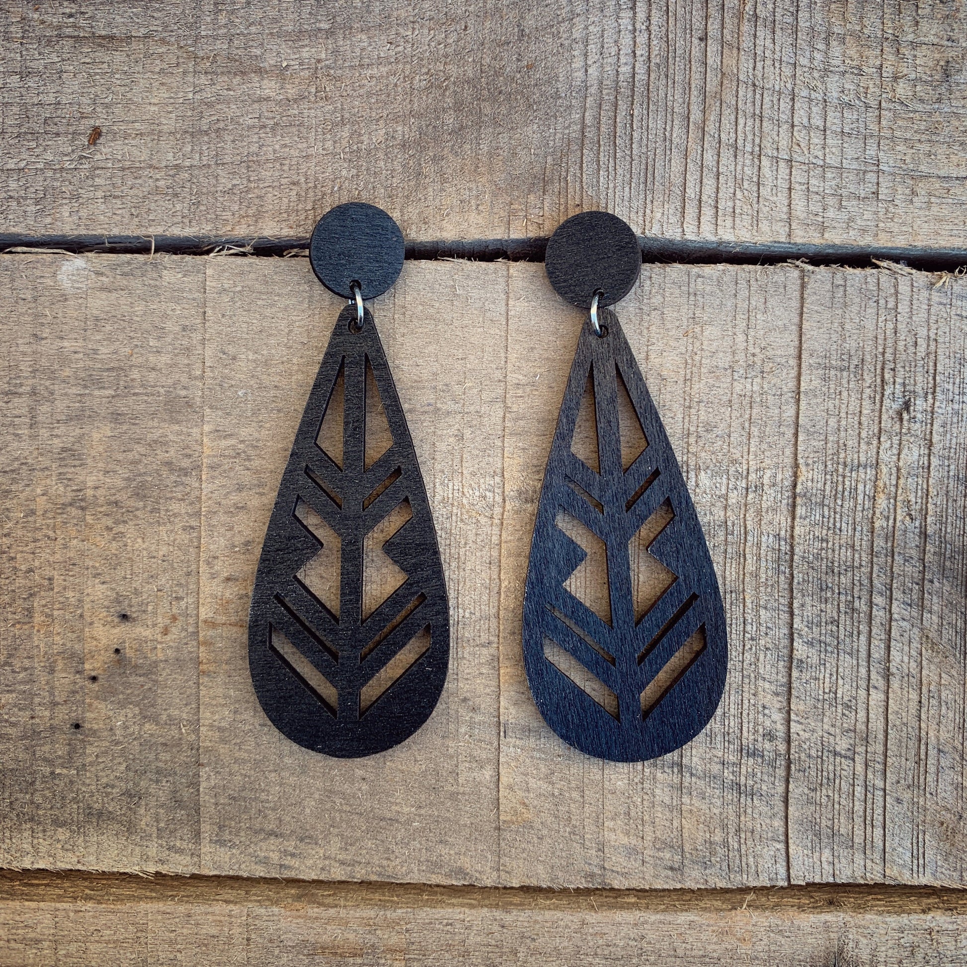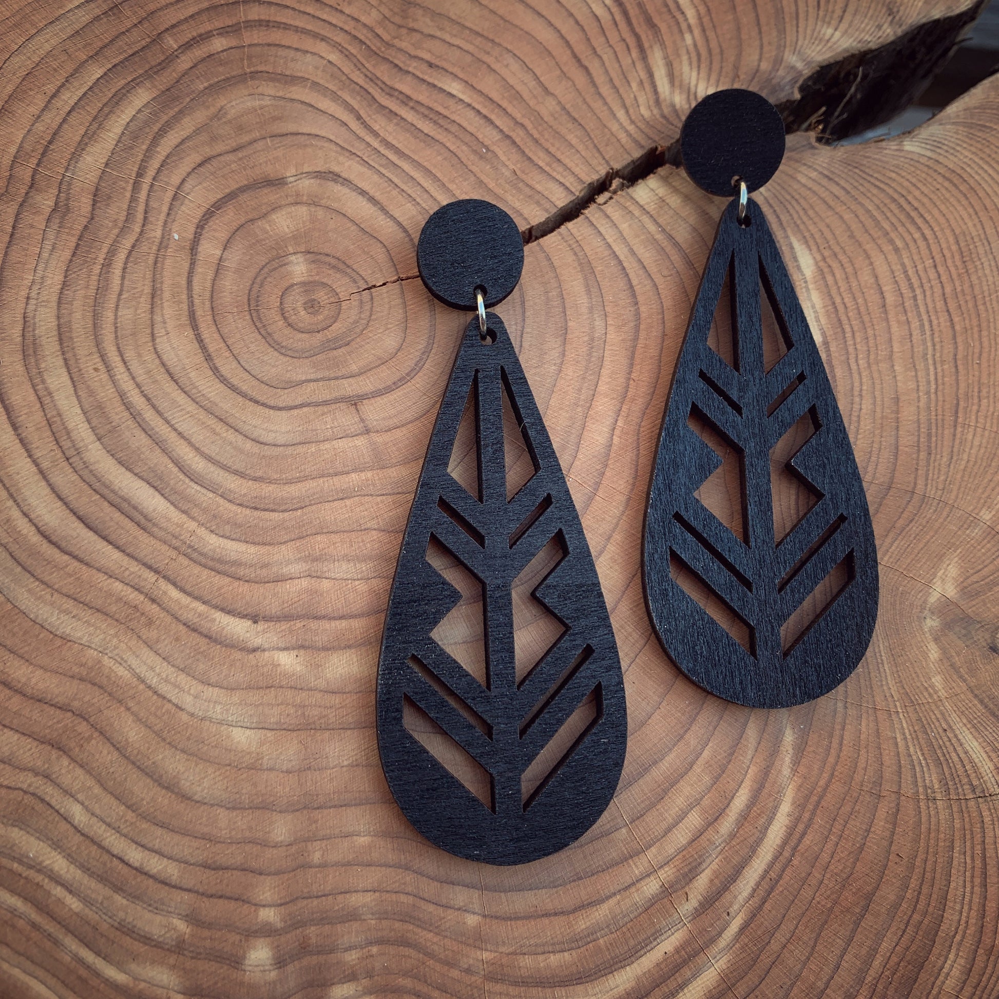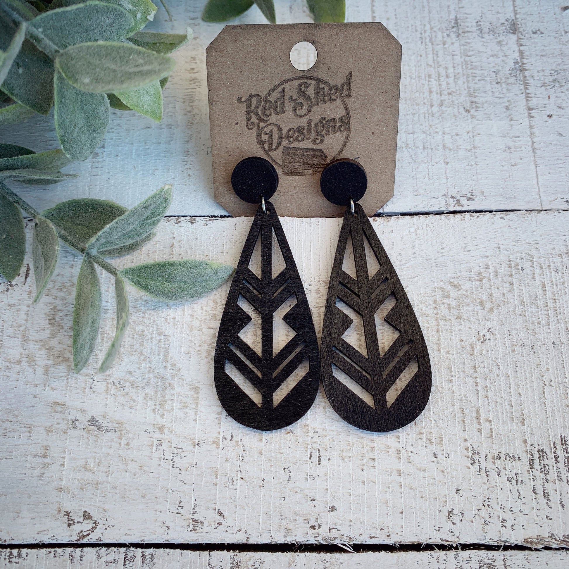 Black Wood Laser Cut Dangle Stud Earrings - Lightweight