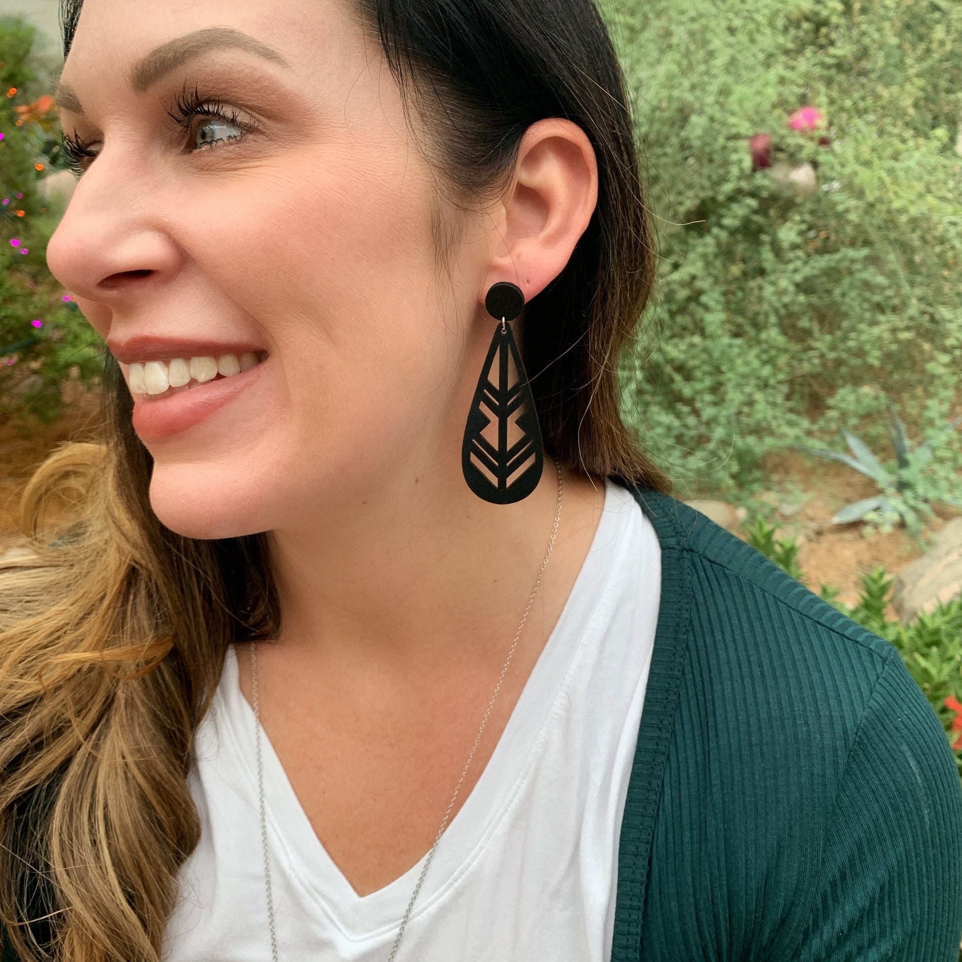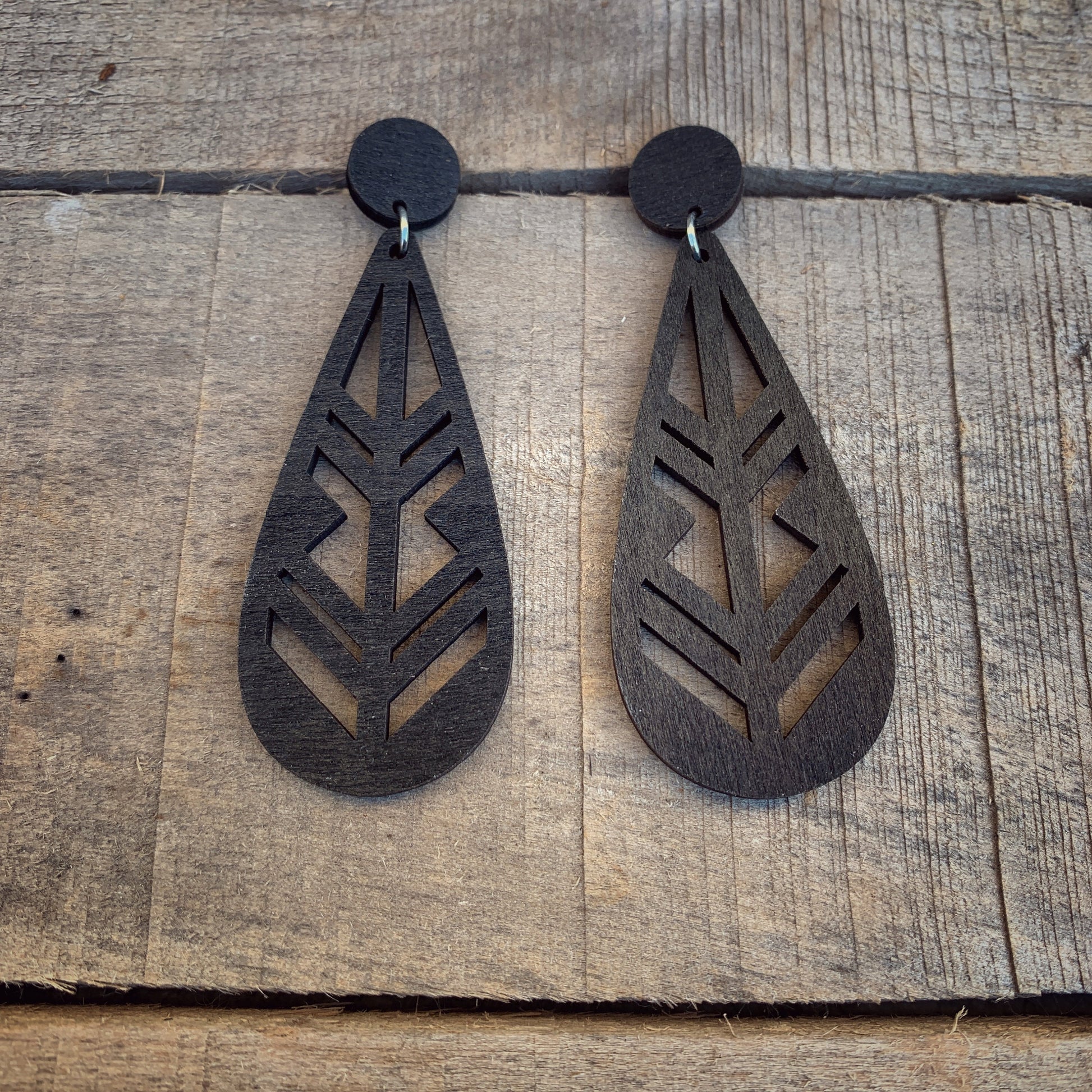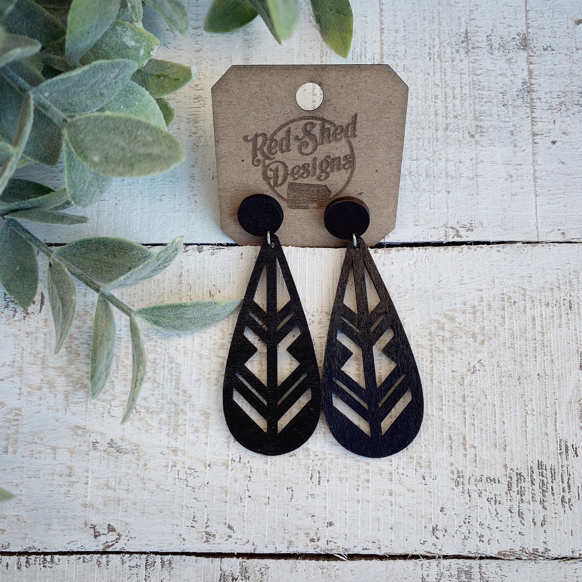Black Wood Laser Cut Dangle Stud Earrings - Lightweight