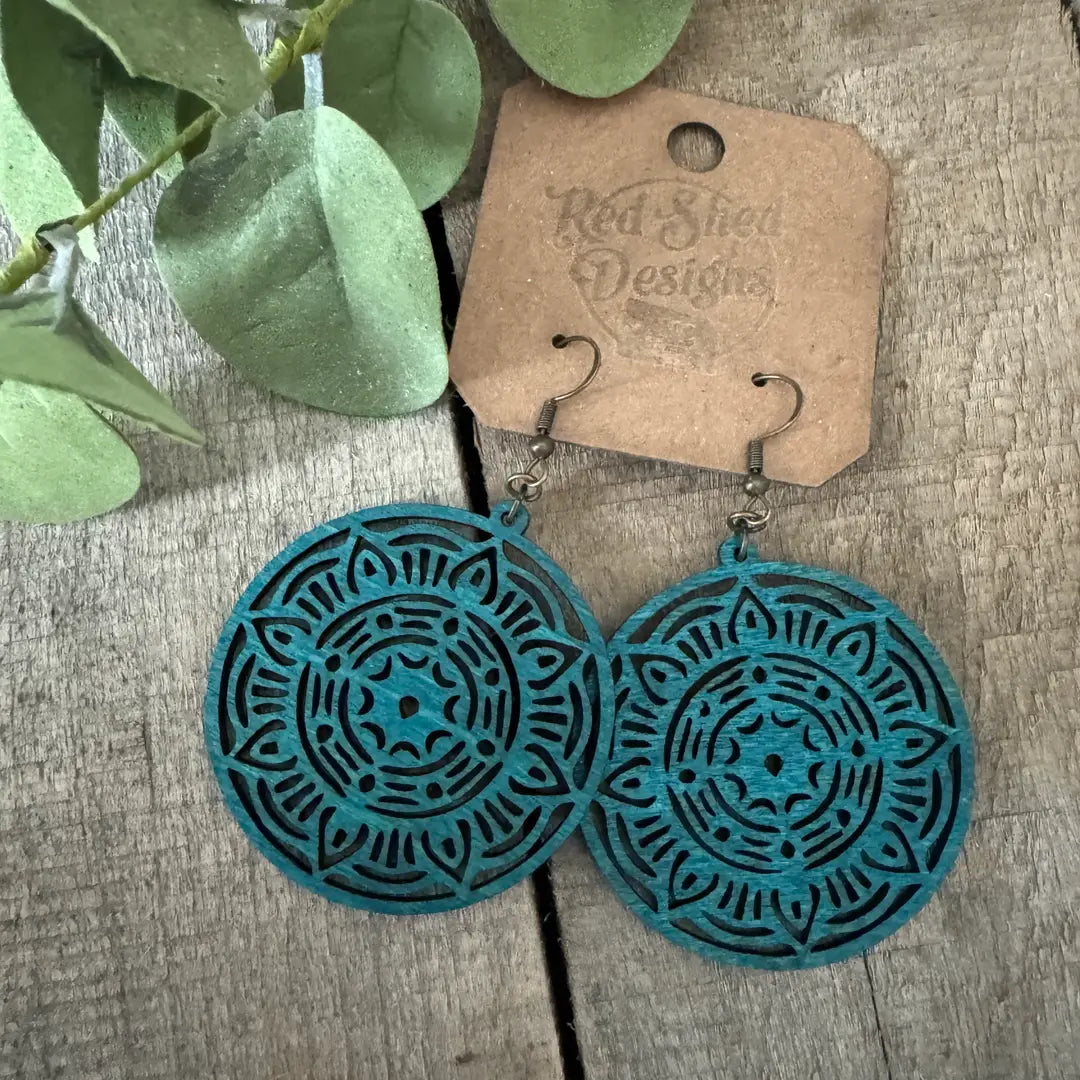 Unique Blue Bohemian Mandala style earrings that are made out of beautiful blue green birch wood with antique bronze hooks. These are a part of our One-of-a-Kind Collection and are very trendy and unique earrings.