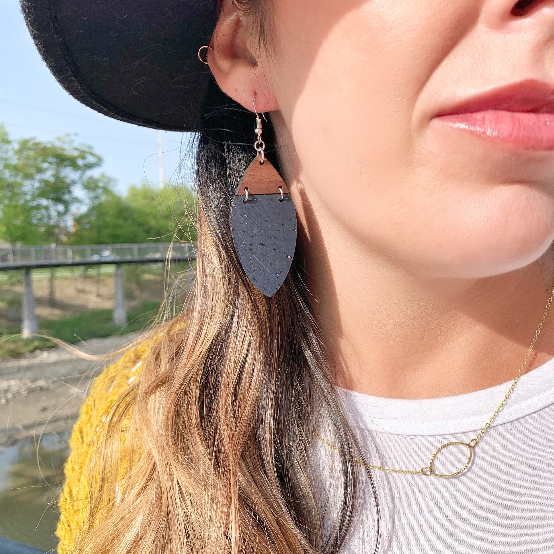 Walnut Wood & Navy Cork Earrings with Bronze Hooks, the cork is a very unique kind of a dark navy color. These are a part of our Cork Collection