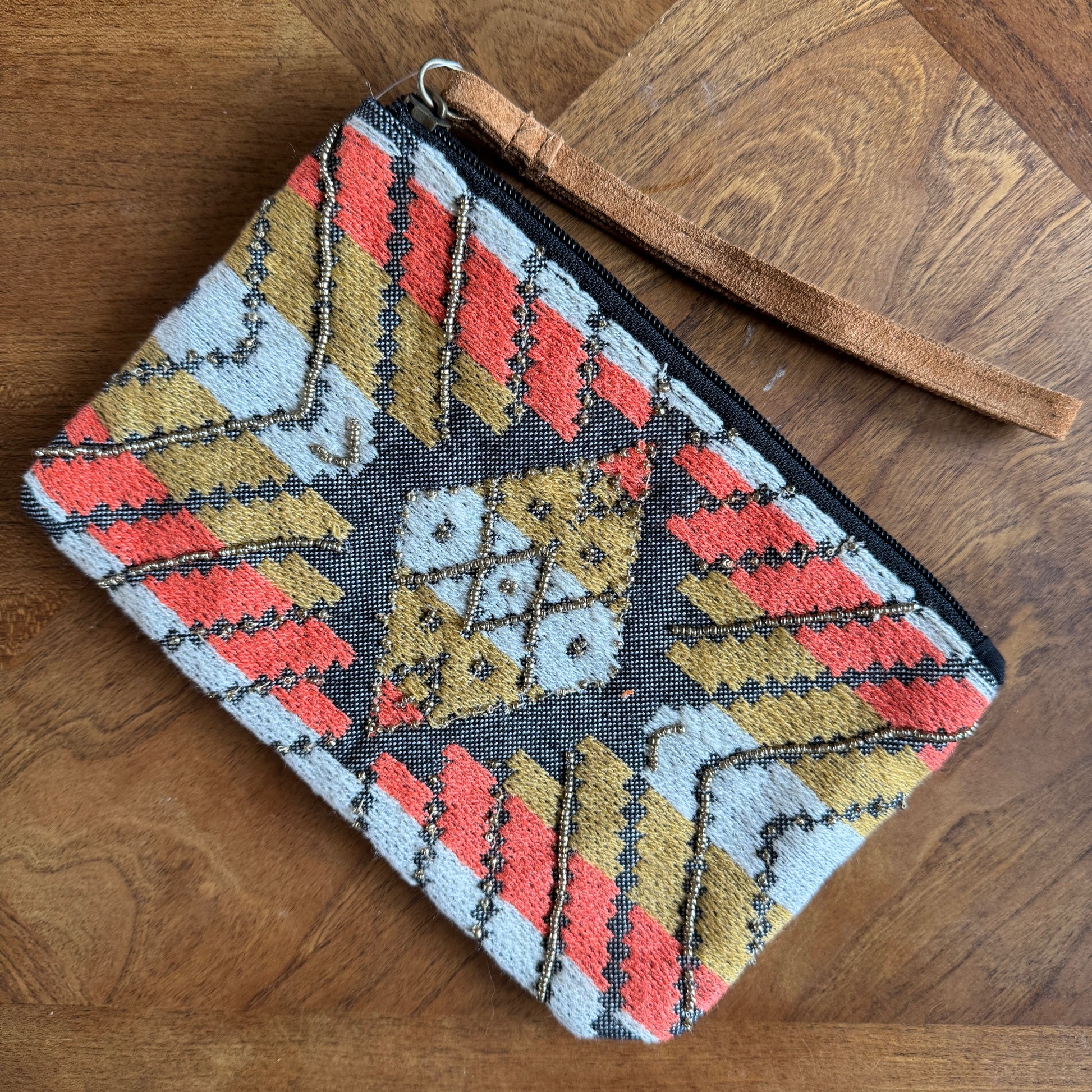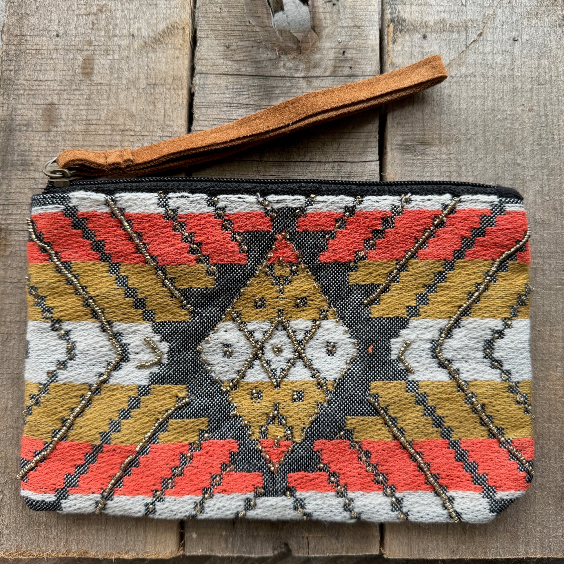 Beautiful Southwest Style fabric wristlet clutch with ethnic diamond and geometric shape patterns decorated in seed beads with leather strap