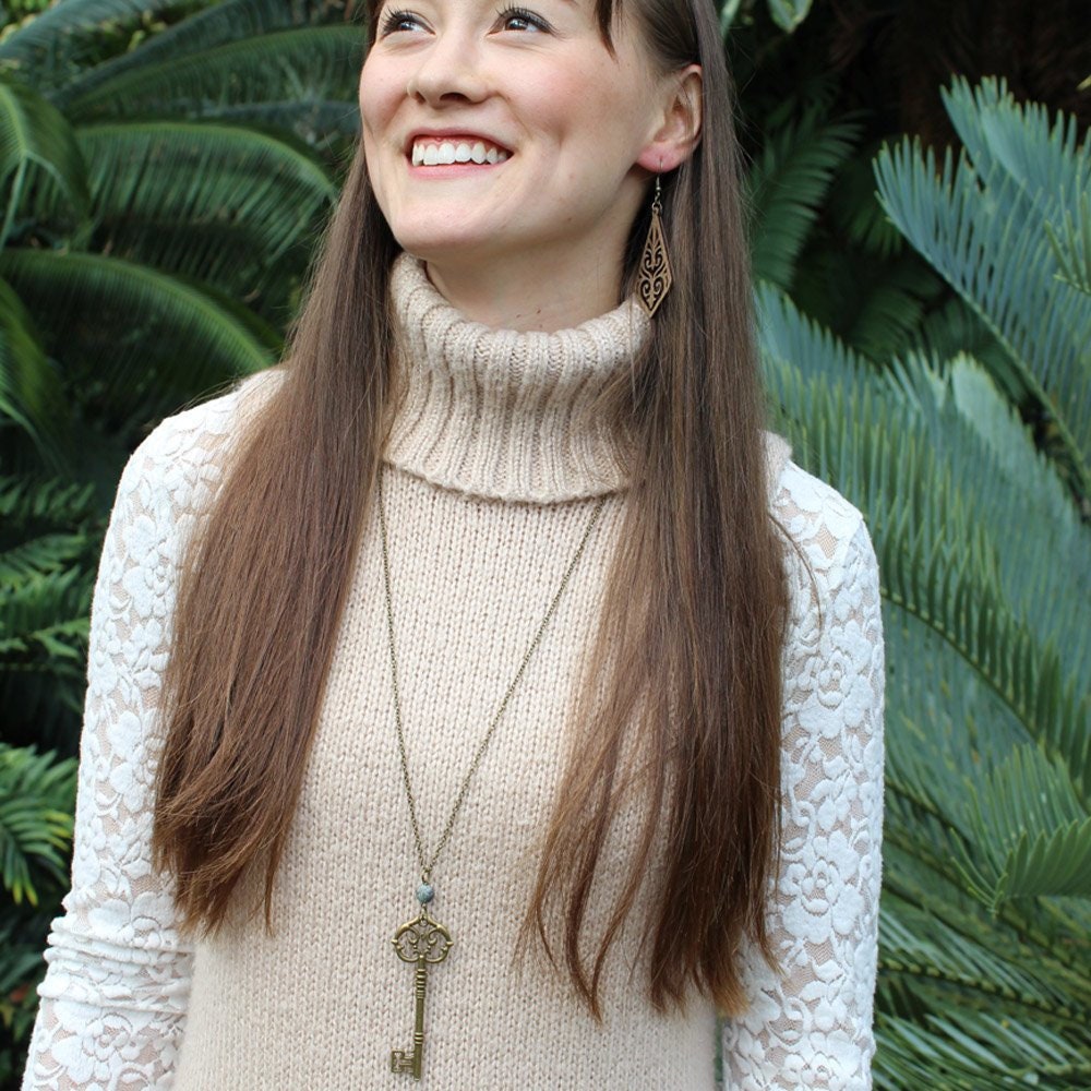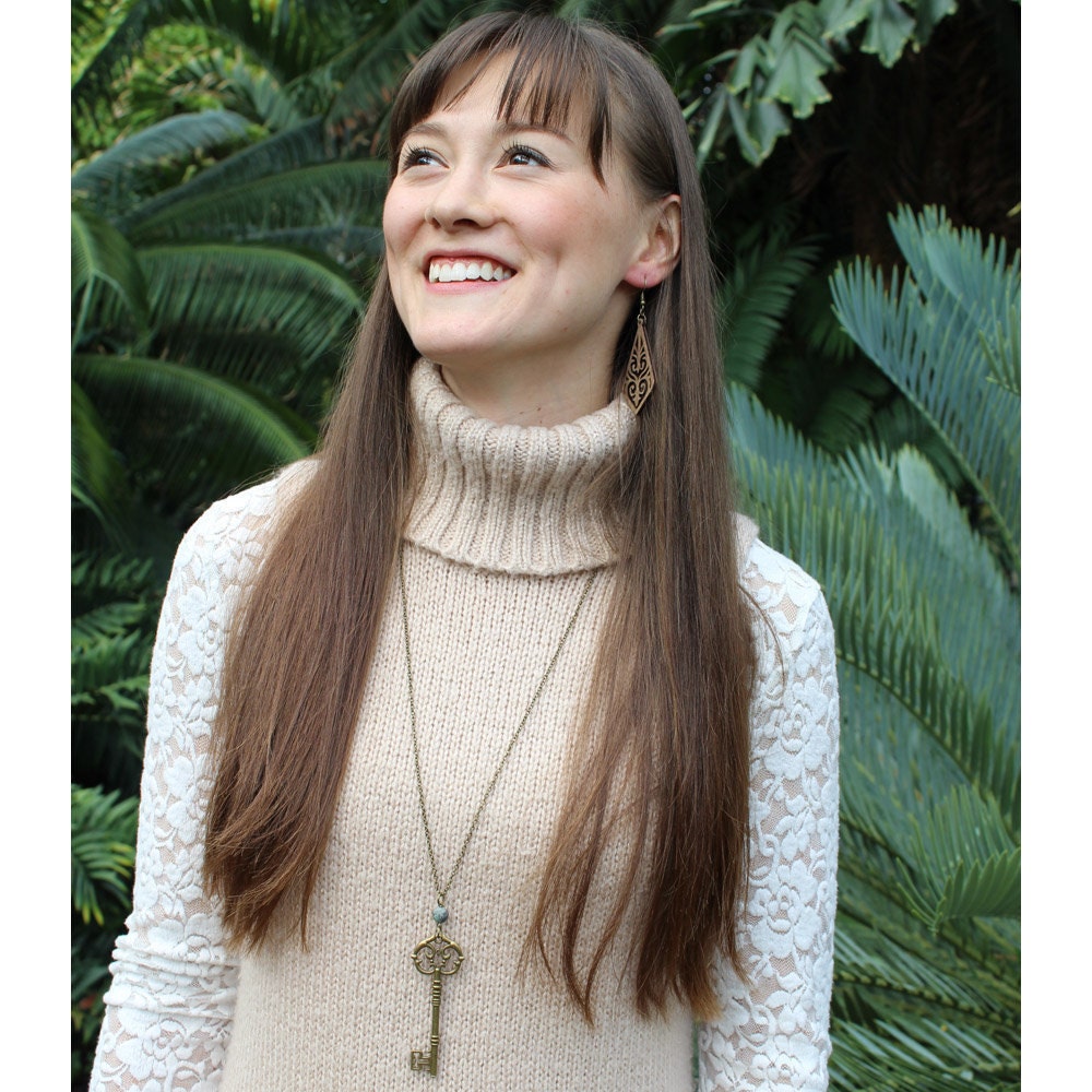 Key Antique Necklace with African Matte Stone Bead - Skeleton Key