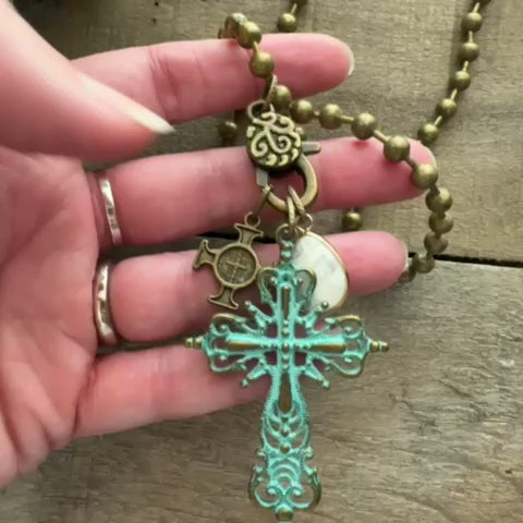 Ball Chain Necklace with 3 Charms, Bronze Cross, Turquoise Cross and Marble Charm