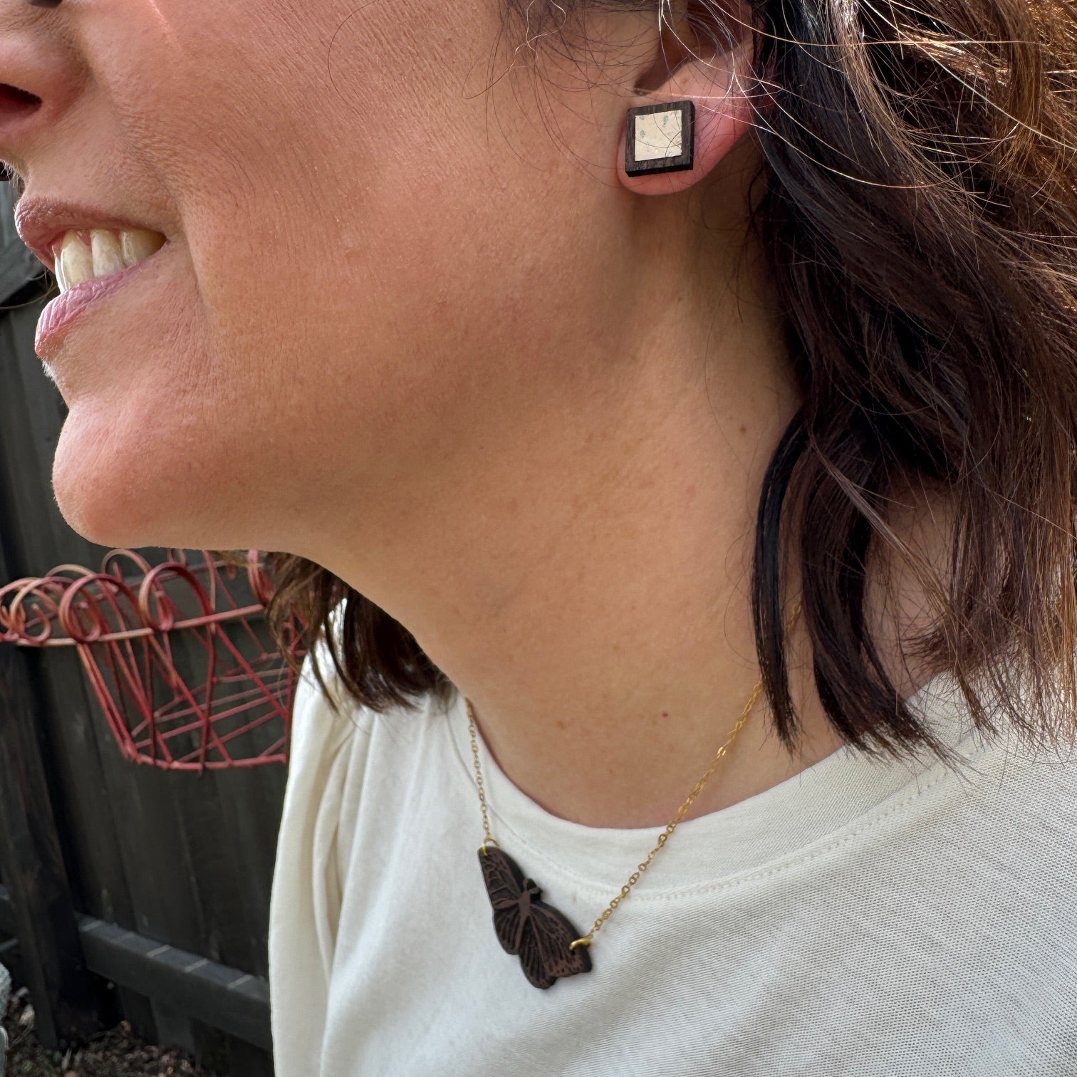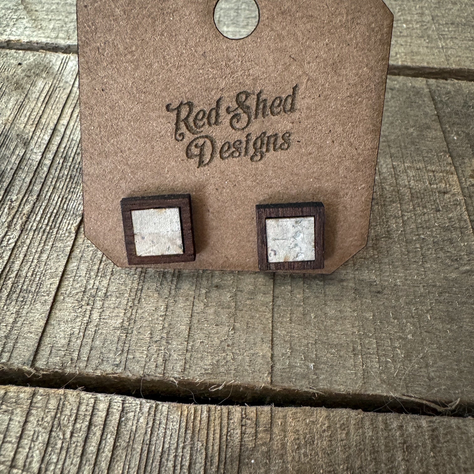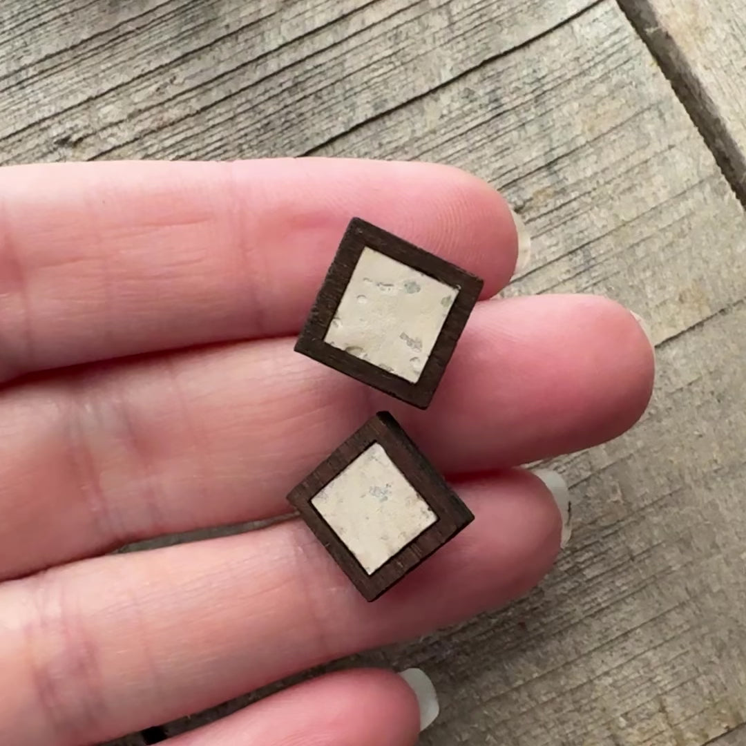 Boho Square Walnut Wood and Pearl White Cork stud earrings these are apart of our Stud Collection.