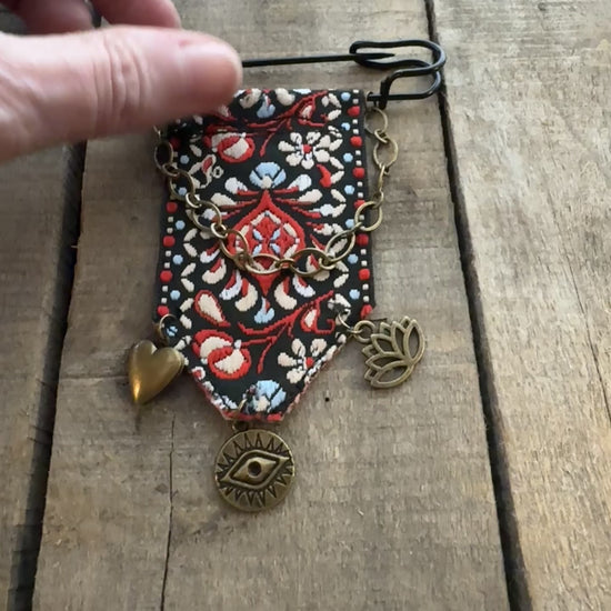 Preppy Bohemian Charm Heirloom Brooch in Bronze & Black- Free People style, the coolest finishing touch, this brooch features an eye-catching embroidered design with dangling chain detailing and shiny metal pendants, Puffy Heart Locket, Evil Eye & Lotus Flower on an extra-large black pin. Perfect and trendy piece for your blazer or wool coat.