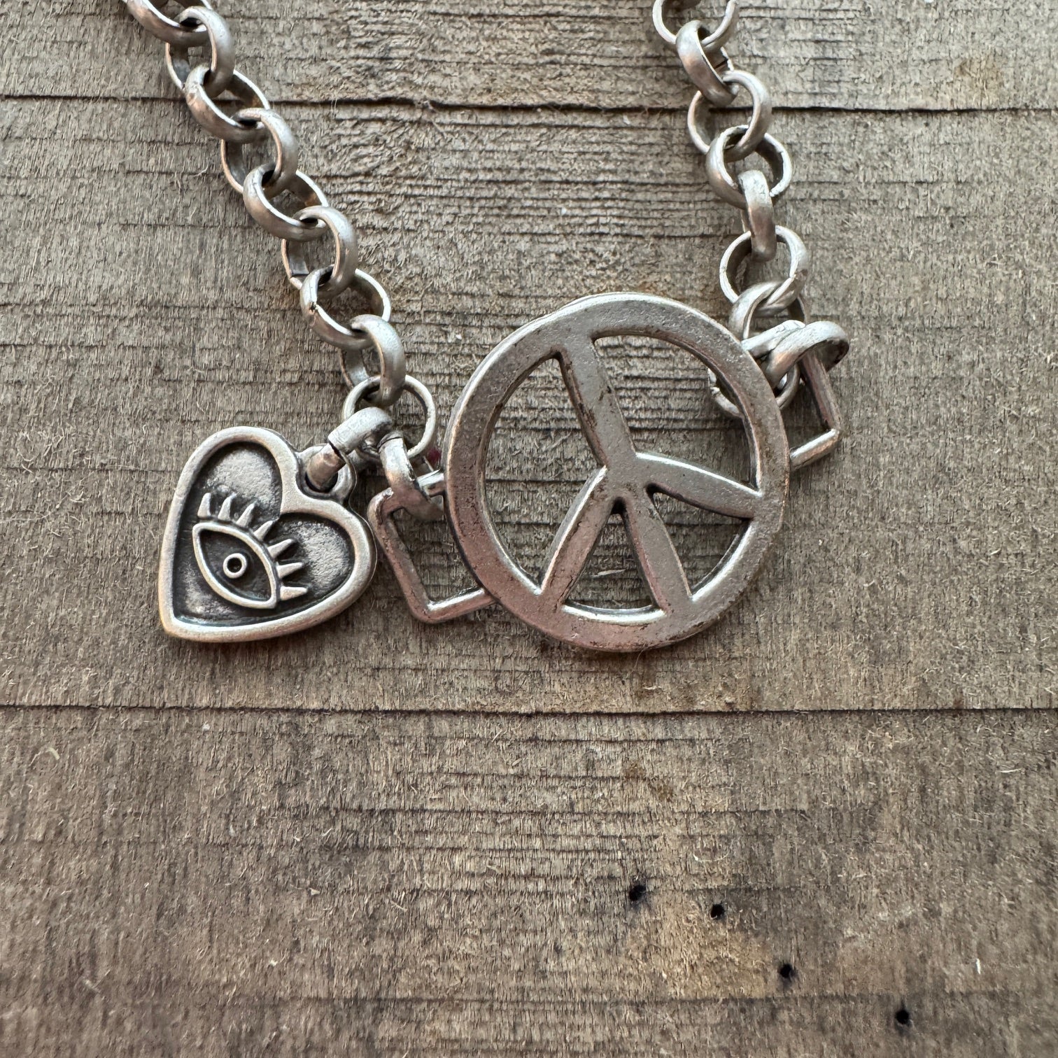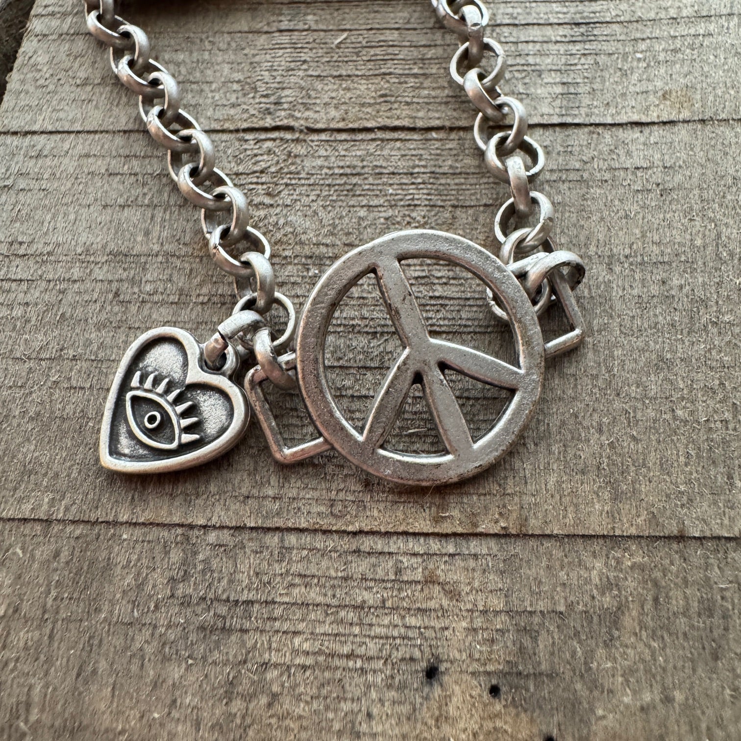 Silver Boho Peace Sign Bracelet with Evil Eye Heart Charm - 8" Bracelet with lobster claw closer. Perfect for your Boho bracelet stack.