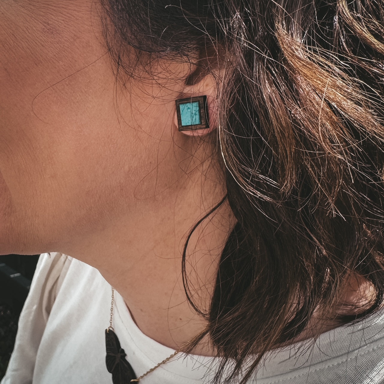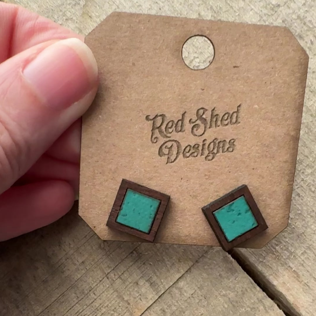 Boho Square Walnut Wood and Turquoise Cork stud earrings these are apart of our Stud Collection.
