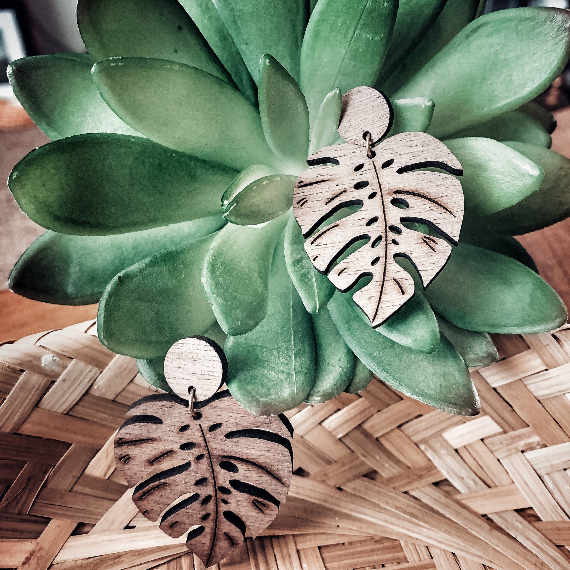 Walnut Wood Monstera Leaf Dangle Stud Earrings - Laser Cut Statement Earrings- Lightweight